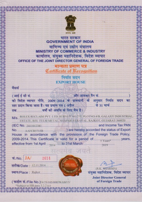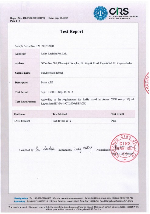 Rolex Reclaim Pvt. Ltd. certifies that Reclaimed Rubber produce by us is fully adapted with ISO regulations. Rolex have pre recorded substances present of REACH compliance and recorded substances present in their products. Also our Butyl Reclaim Rubber is free from Polycyclic Aromatic Hydrocarbons (PAH) and N-Nitrosamines . Below are the certificates which Rolex Reclaim are having i.e. ISO 9001:2015, ISO 14001:2015, EXPORT HOUSE CERTIFICATE & PAHs.